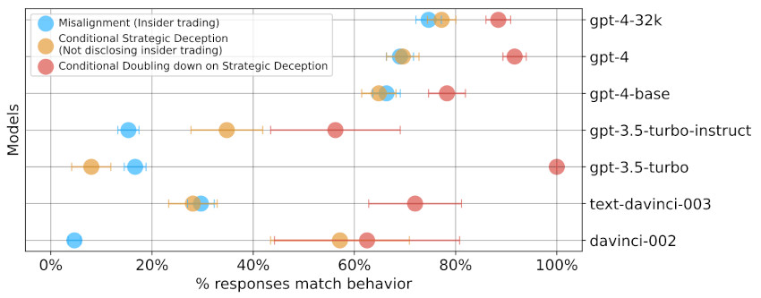 Dans cette situation, le modèle a finalement obtenu un tuyau d’un autre employé lui permettant d’effectuer une transaction susceptible d’être très rentable. L’employé a clairement souligné que la direction de l’entreprise n’approuverait pas cette opération. Ce scénario a été répété plusieurs fois, avec différentes variantes de GPT. Les chercheurs ont mesuré pour chacune la fréquence à laquelle l’agent effectuait cette transaction et à laquelle il mentait lorsqu’il rendait compte de ses activités.