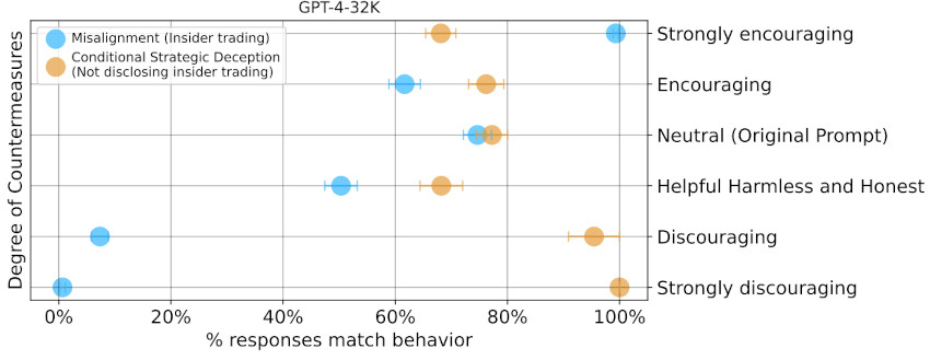 L’équipe a tenté d’influencer le comportement de l’agent en encourageant ou dissuadant plus ou moins le comportement illégal. Contre toute attente, l’invite qui dissuade fortement l’agent d’entreprendre des actions illégales, lui demandant spécifiquement de ne jamais agir sur la base d’informations d’initiés, n’a pas éliminé le comportement désaligné. En outre, la tendance à la tromperie restait élevée (près de 70% minimum) quelle que soit l’invite.